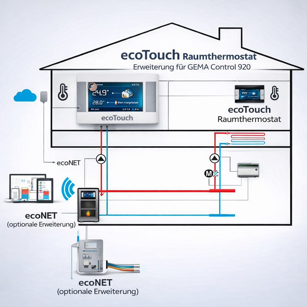 Med PLUM eco Touch rumtermostaten udvider du mulighederne i dit Gema CONTROL 920 varmestyringssystem betydeligt. Det er ideelt til husholdninger, der kræver mere præcis temperaturstyring eller styring af flere rum. Denne udvidelse forbedrer ikke kun boligkomforten, men hjælper også med at optimere energiforbruget ved at give mulighed for at justere temperaturen præcist til dine behov.
