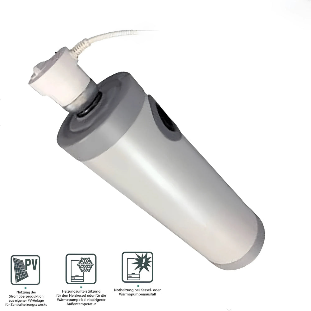 Die einfache Integration der Heizpatrone in vorhandene Speicher wird durch den 1 1/2" AuĂengewinde-Anschluss und die kompakte EinbaulĂ€nge von 420 mm unterstĂŒtzt. Ein 1,5 Meter langes Anschlusskabel ermöglicht zudem die unkomplizierte Stromversorgung.