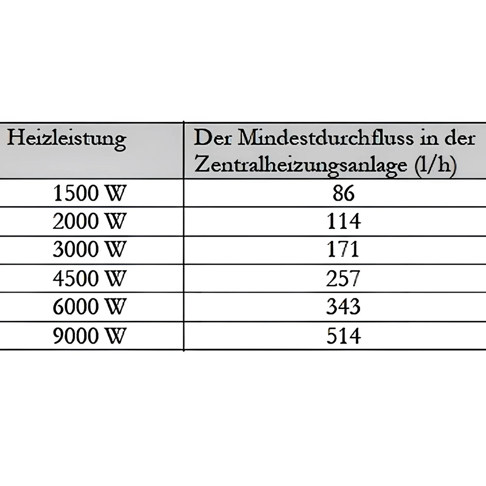 Die Minimaldurchflusswerte â 86 l/h fĂŒr 1,5 kW, 114 l/h fĂŒr 2,0 kW, 171 l/h fĂŒr 3,0 kW, 257 l/h bei 4,5 kW, 343 bei 6,0 kW und 514 bei 9,0 kW â garantieren auch bei variierendem WĂ€rmebedarf eine effiziente WĂ€rmeĂŒbertragung und einen reibungslosen Betrieb.
