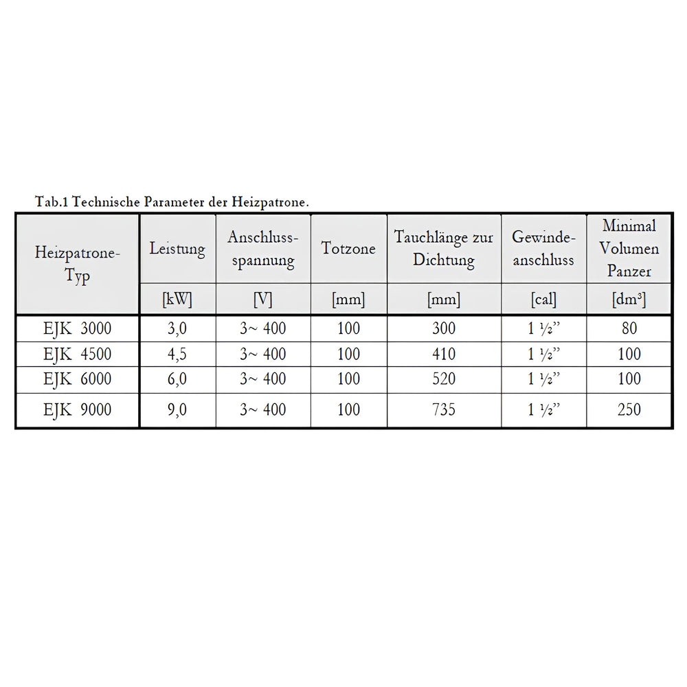 Die Heizpatrone des Komplettpakets ist in unterschiedlichen Leistungsklassen erhĂ€ltlich, speziell konzipiert fĂŒr 1,5 kW, 2,0 kW, 3,0 kW bei 230 V sowie 4,5 kW, 6,0 kW und 9,0 kW bei 400 V. Diese Varianten ermöglichen eine optimale Anpassung an den individuellen Energiebedarf des Heizsystems.