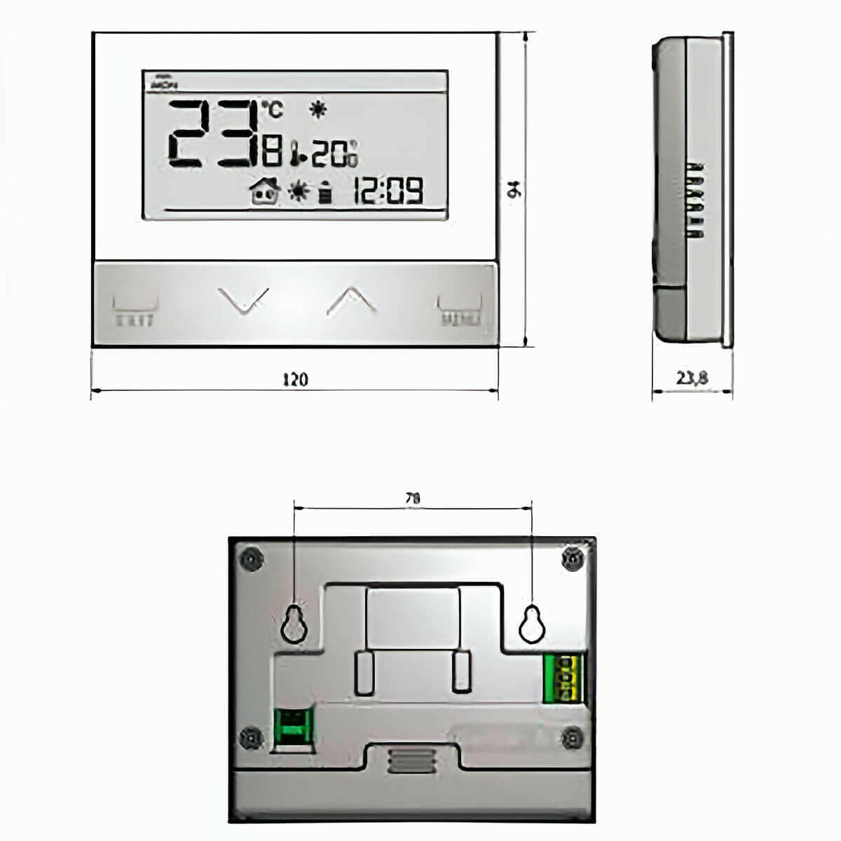 Termostat impresionira svojim visokokvalitetnim izgledom: Prednja ploča izrađena je od 3 mm debelog stakla, koje ne samo da izgleda moderno, već je i posebno robusno. 3,6-inčni LCD zaslon s pozadinskim osvjetljenjem osigurava jednostavnu čitljivost, čak i u uvjetima slabog osvjetljenja. Dodirne tipke nadopunjuju elegantan dizajn, a istovremeno nude intuitivno rukovanje.
