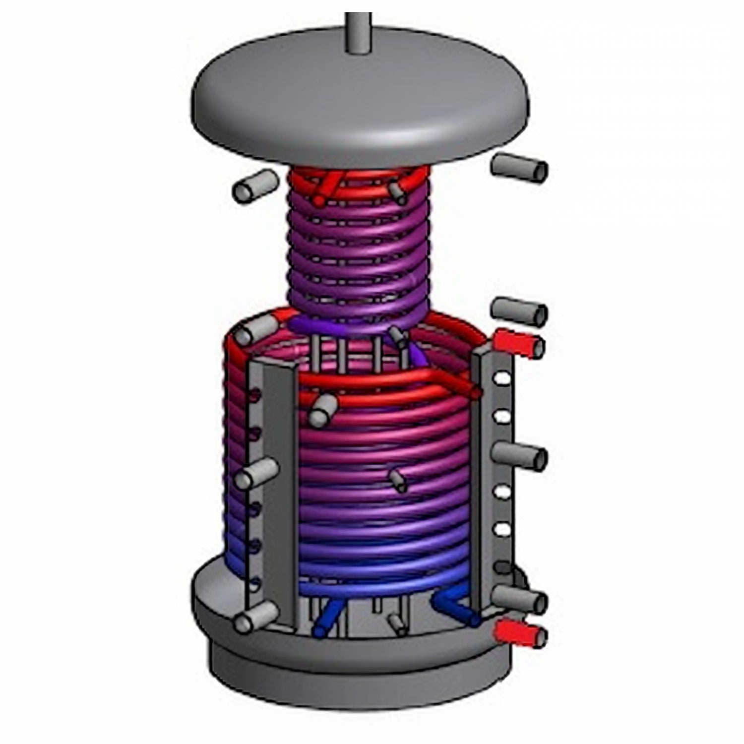 Nerūsējošā tērauda gofrētā caurule kalpo kā saldūdens siltummainis, pateicoties tās lielajai virsmas platībai, piedāvājot augstu plūsmas un ražas vērtību. Tvertnē esošais īpaši lielais gludās caurules siltummainis ir pieejams saules un apkures pieslēgumiem un nodrošina efektīvu siltuma apmaiņu starp apkures un dzeramā ūdens ķēdēm.